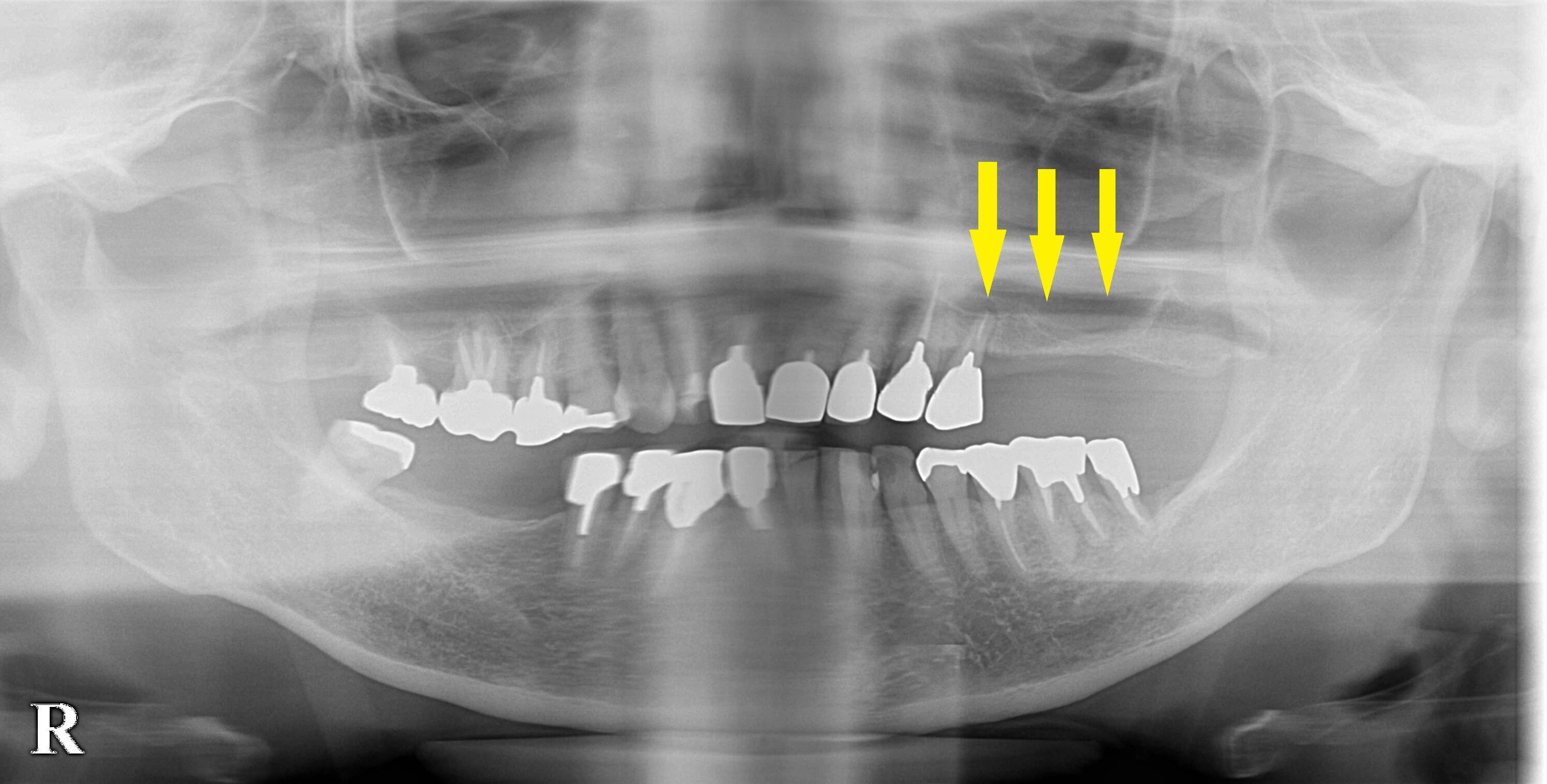 左上顎に残った小臼歯は、歯根を支える歯槽骨が、大きく吸収され、骨の吸収は上方の空洞まで達していました。