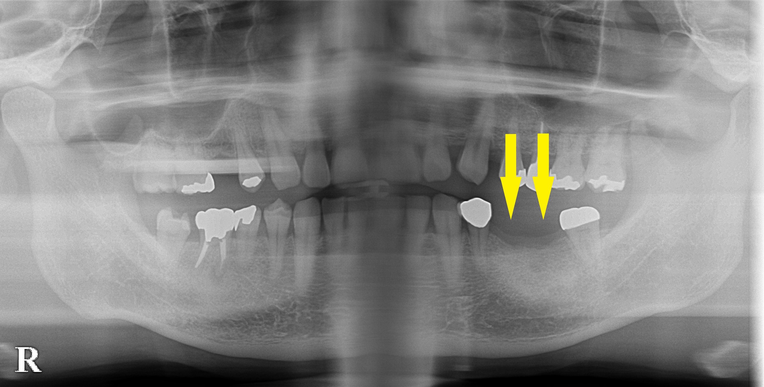 右下顎にブリッジが装着されていたのですが、1年ほど前に支えになっていた歯が脱落、しばらくそのまま過ごされていたそうです。