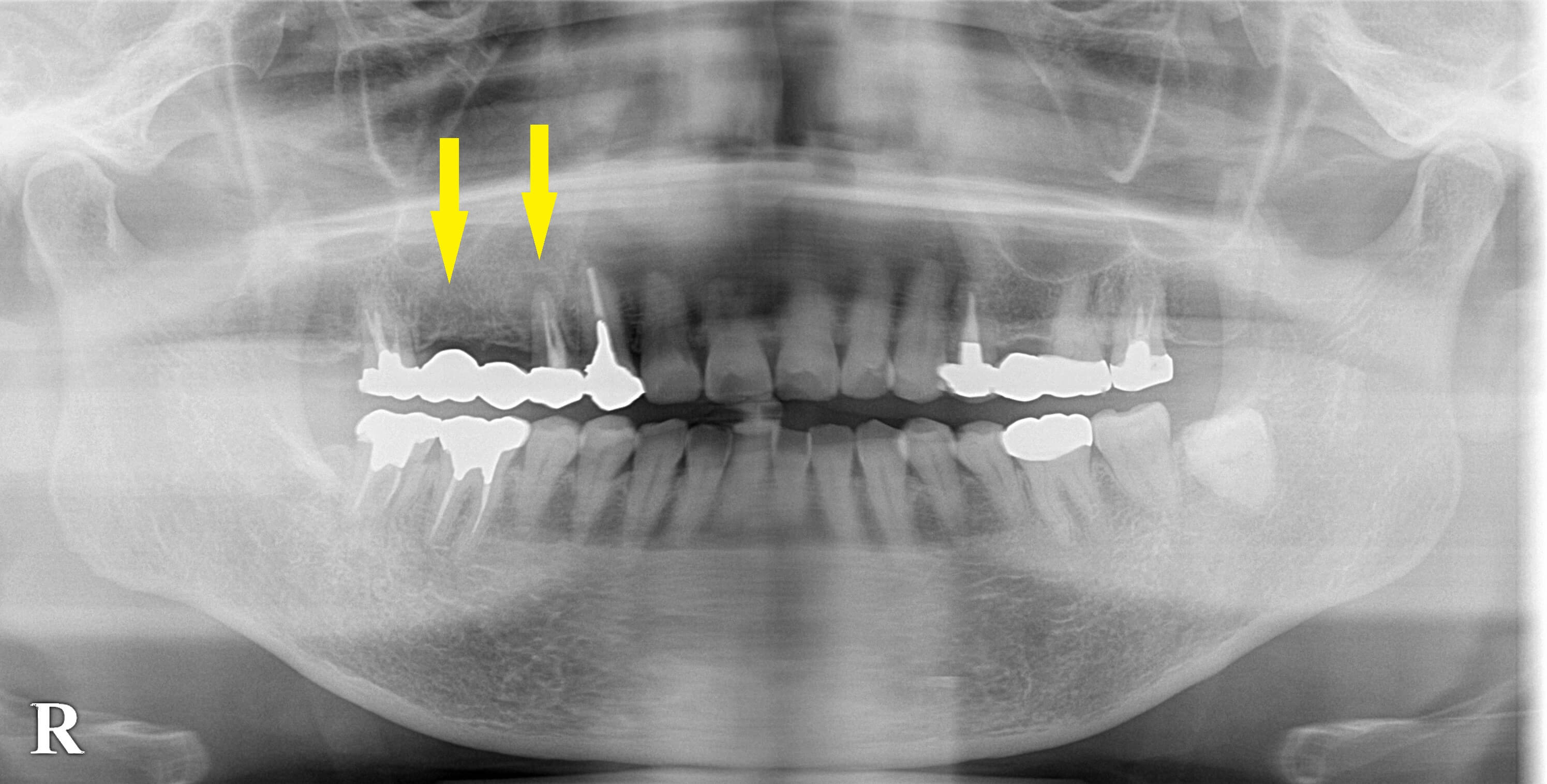 右上顎にブリッジが装着されていたのですが、支えになっている前方の歯が破折してきてしまいブリッジが外れてしまったそうです。