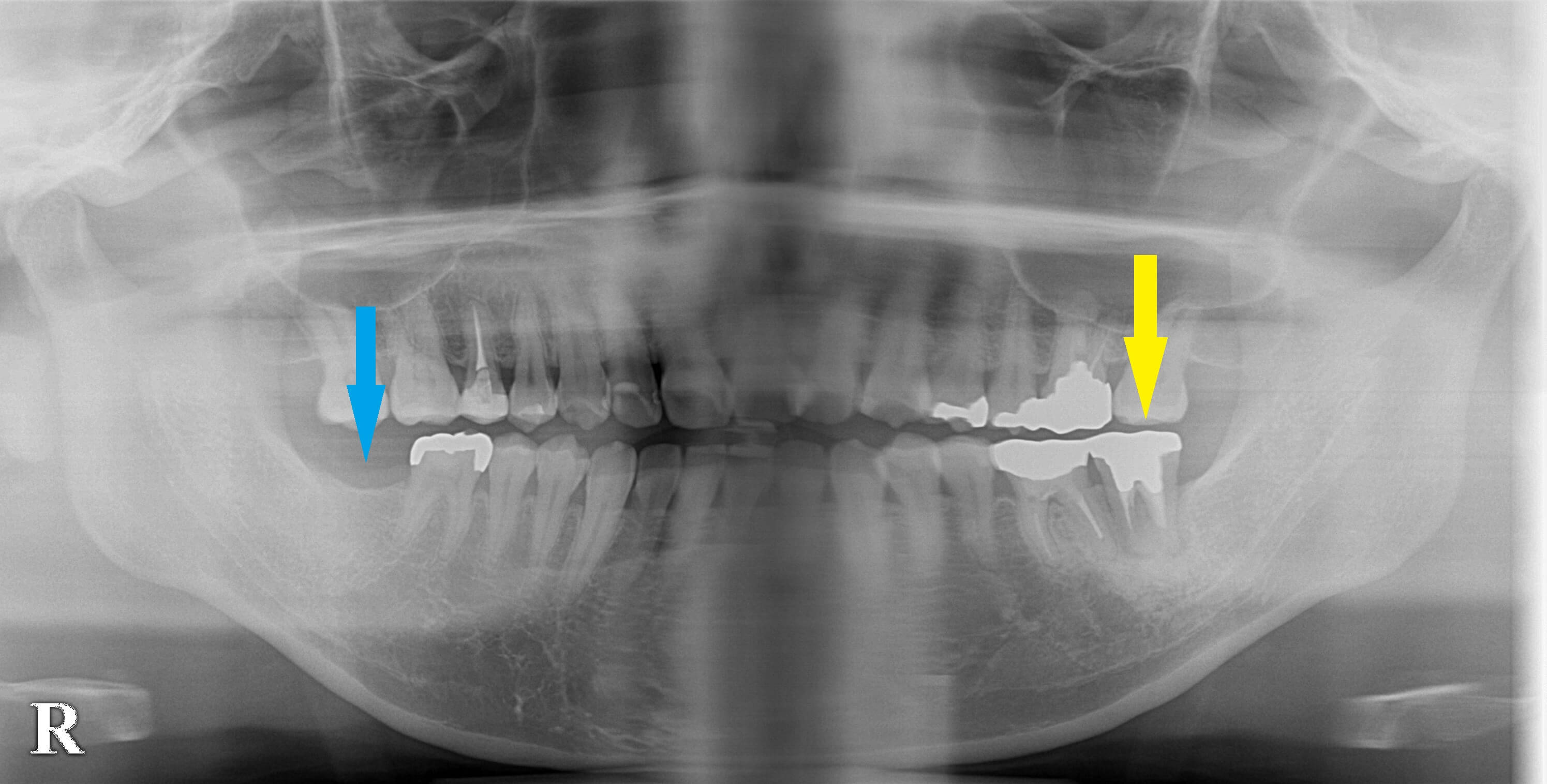 数か月前に右下顎第二大臼歯の欠損(写真青矢印)で、インプラント治療を希望されて来院され、1本インプラント埋入を行って上部構造を装着し治療が終了していた患者様です。