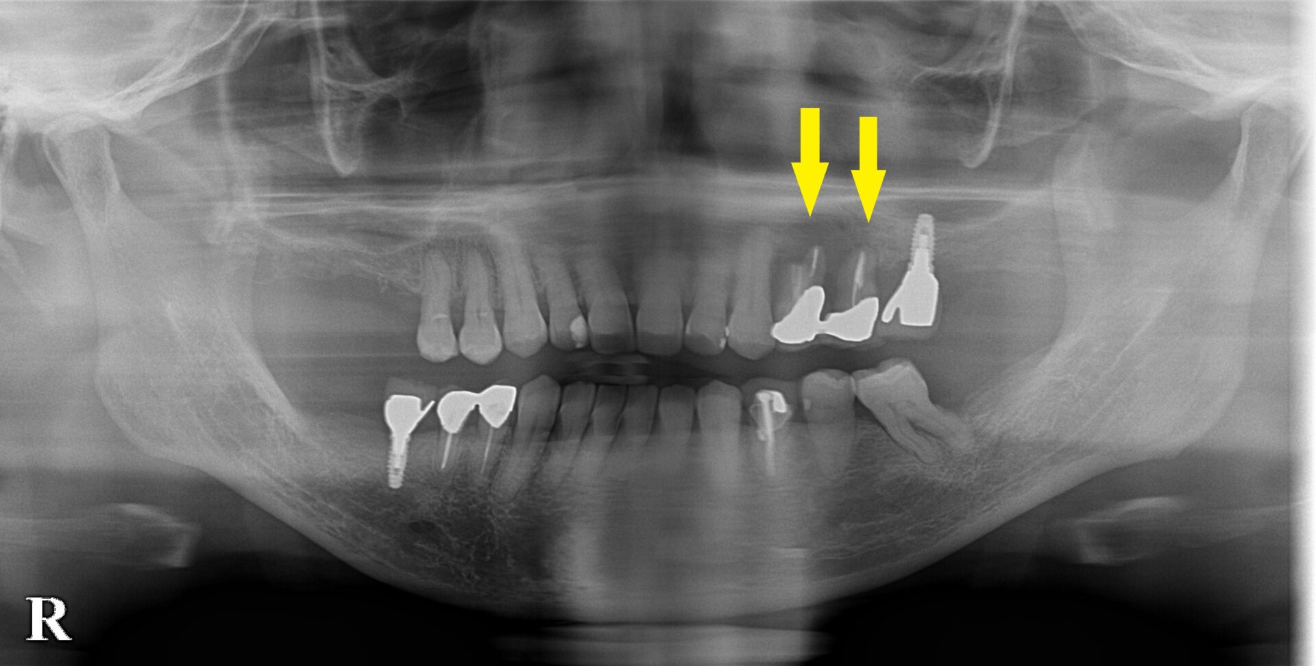 今回は、左上顎の小臼歯2本が、被せものの中で崩壊状態となり、破折も起こしていて、抜歯しなければならない状態でした。