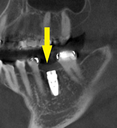 CTで見ると、頬側の骨が吸収されてしまっているので(下の2段目左)、抜歯して、治癒を待ってからインプラントの埋入を行うこととしました。