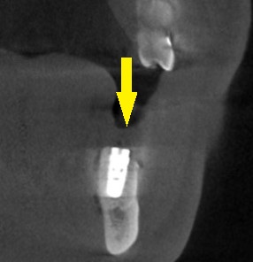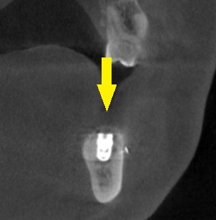 インプラントと神経までの距離は確保され、インプラント上方は人工骨で覆われています。