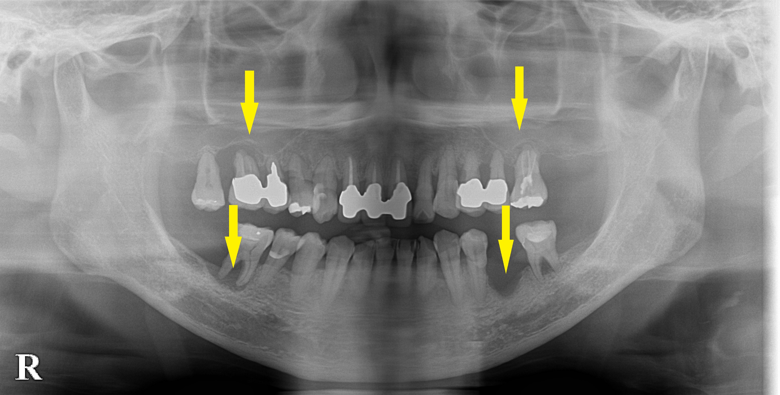 上下左右とも大臼歯が、重度の歯周病で大きく骨が吸収されてしまっている患者様です。