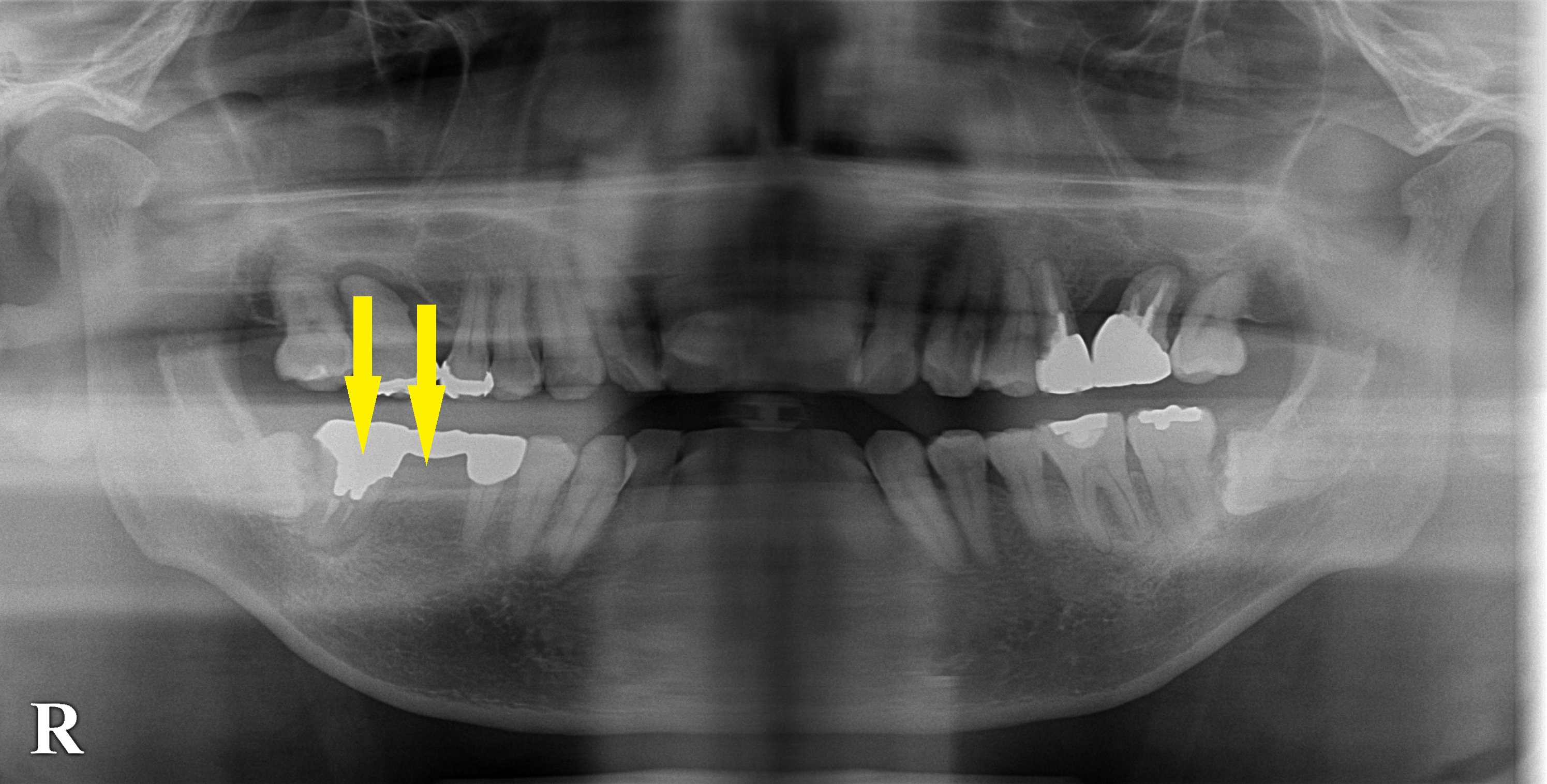 右下顎のブリッジがグラグラするということで、今まで通院していた歯科医院に行ったところ、ブリッジの支えになっている後方の歯がもうダメで抜歯しなければならないと言われたそうです。